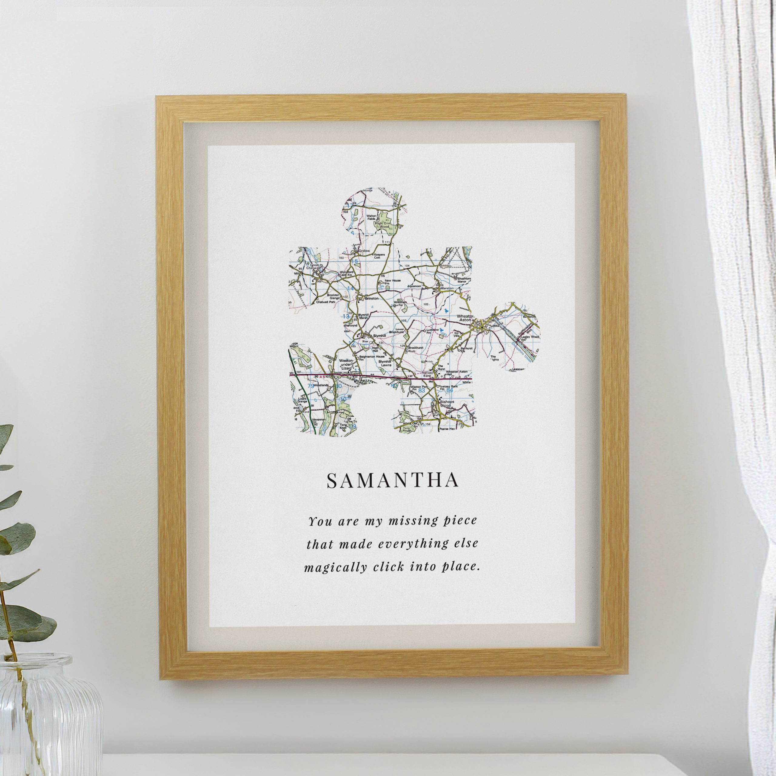 Personalised Present Day Map Puzzle Piece Oak Poster Frame